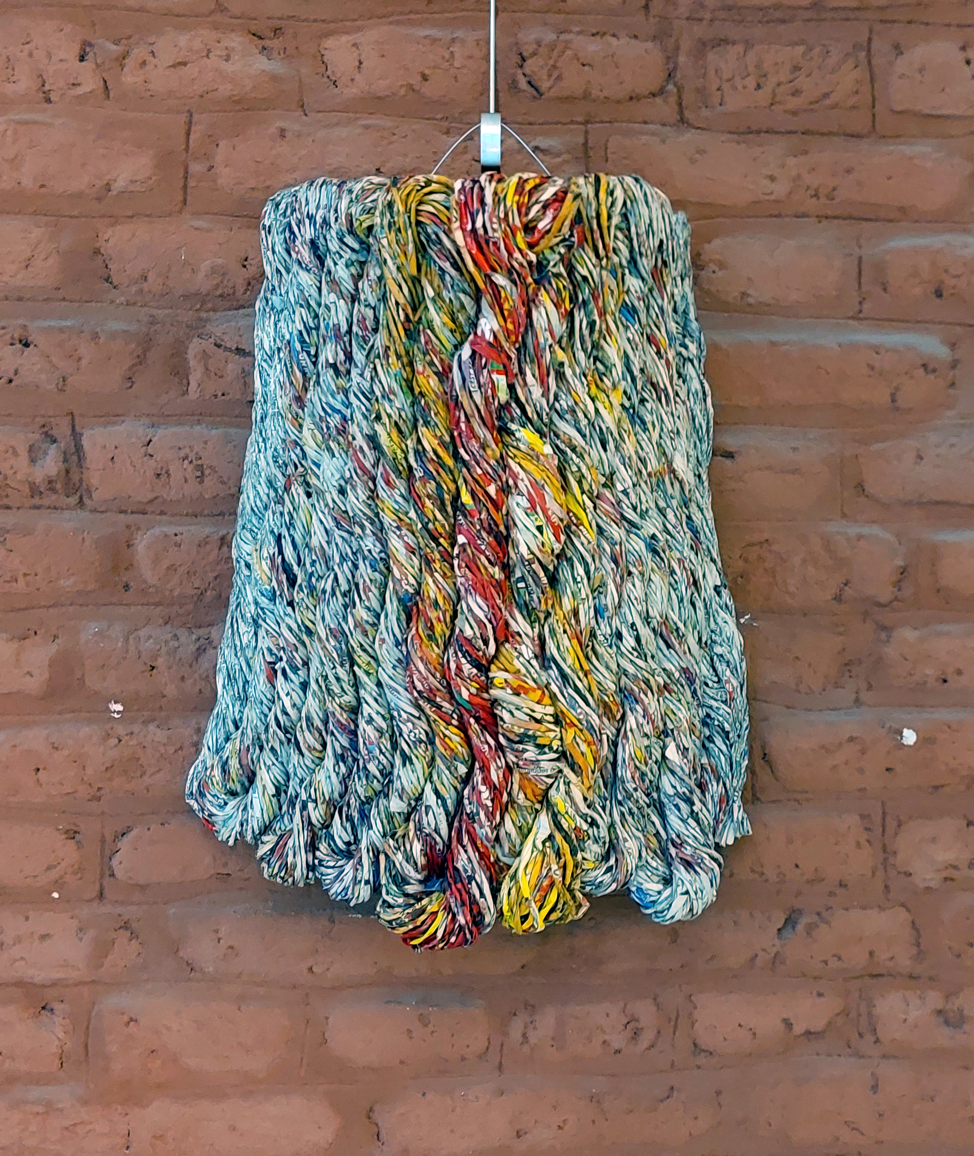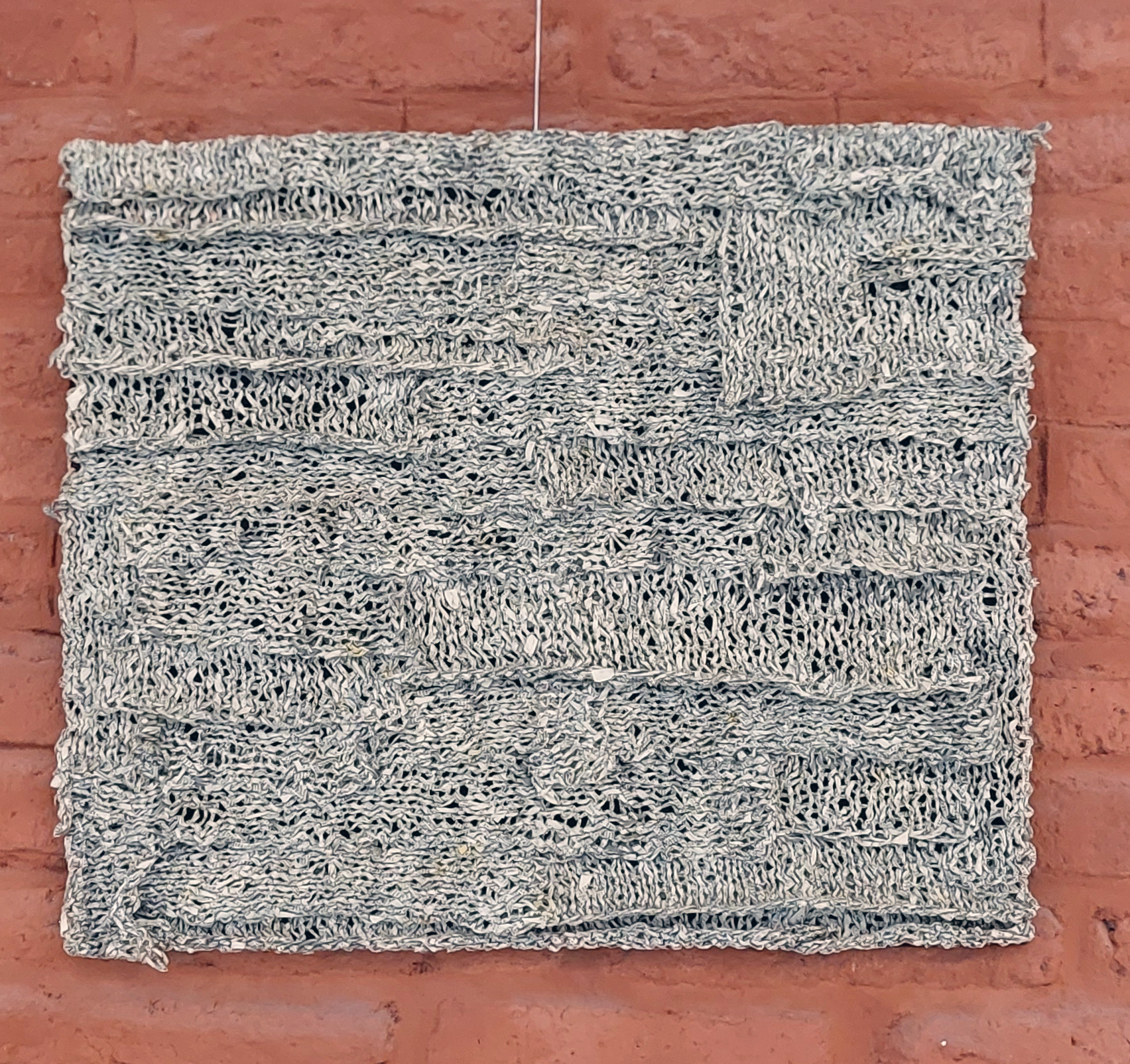 Carré tricoter 50 x 50 cm. 2022. Fil de papier fait main avec de l'emballage de chicon, papier d'emballage boucherie traiteur