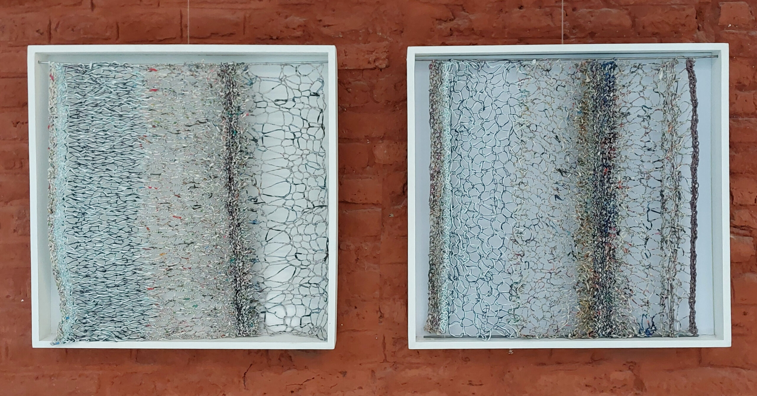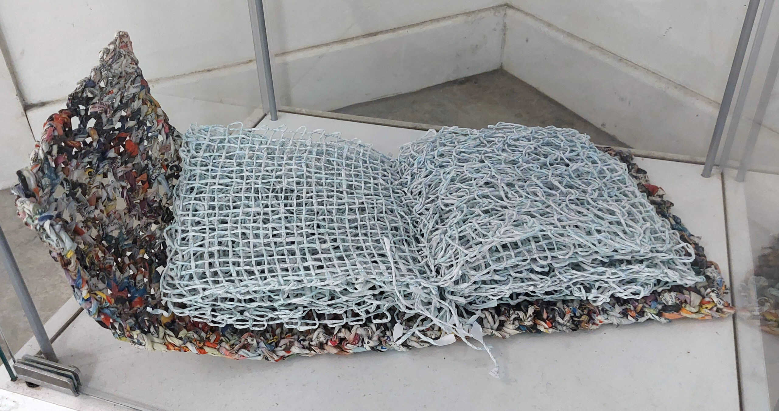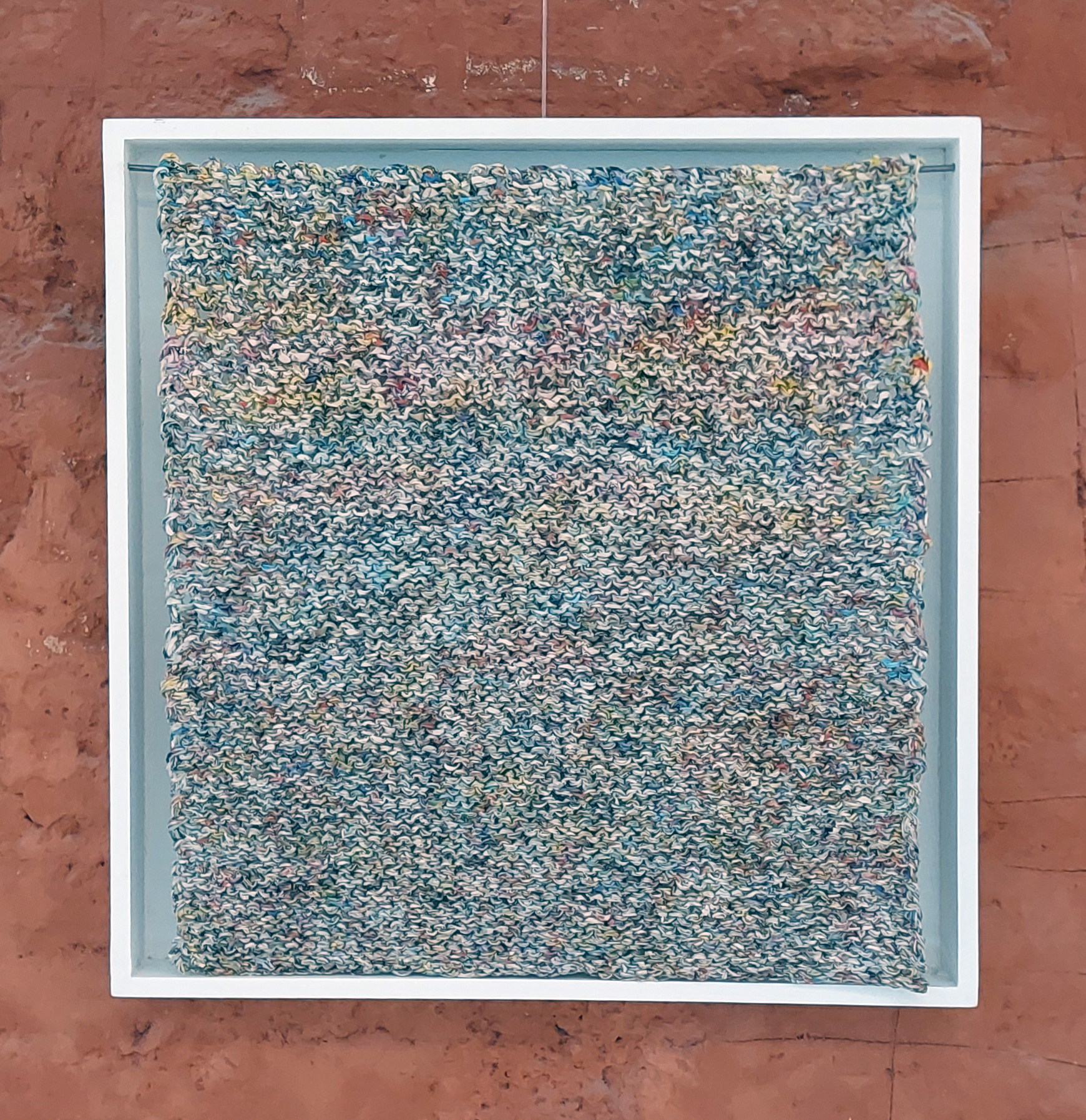 Tricot 50 cm x 50 cm. 2022. File de papier fait main avec du papier folder publicitaire. Le tricot est mis dans une boîte en bois peinte de couleur blanche aux dimensions plus ou moins 53 x 53 cm