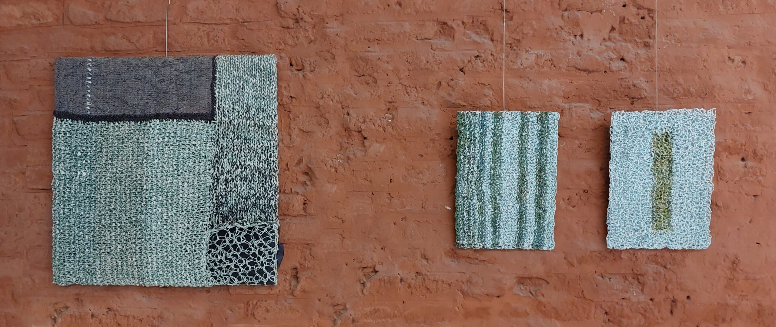 Les petits formats sont de dimensions A4. Tricots. Fil fait main avec du papier de listing informatique, papier vert sélectionné dans les pages de magazines. 2017.