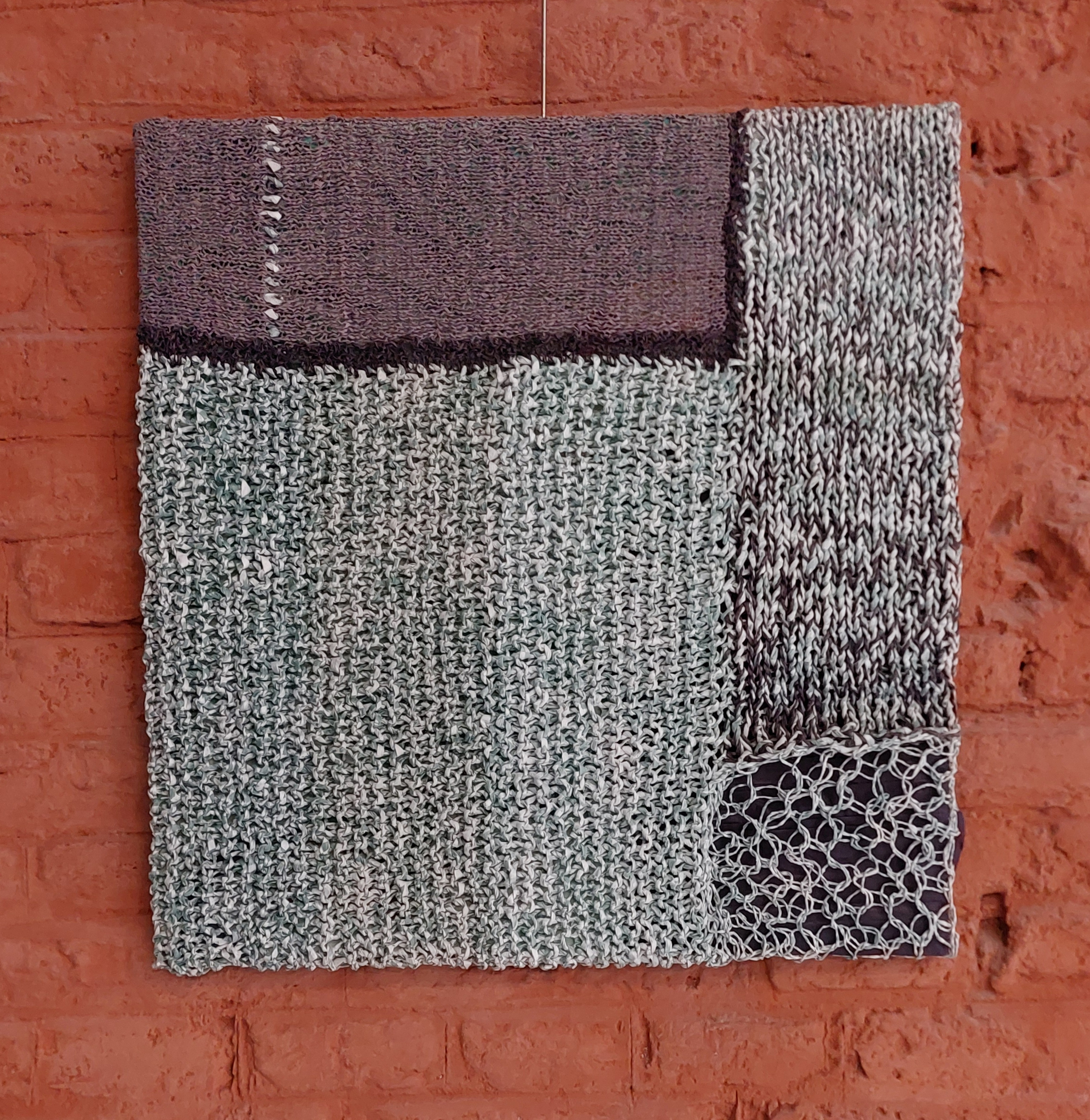 Carré 50 x 50 cm tricoté , avec des grosses aiguilles ou des plus fines aiguilles ce qui donne le point ajouré ou serré. Fil fait main avec du papier journal, programme tv, papier d'emballage chicon, listing informatique. Le tricot est mis dans une boîte en bois peinte de couleur blanche aux dimensions plus ou moins 53 x 53 cm