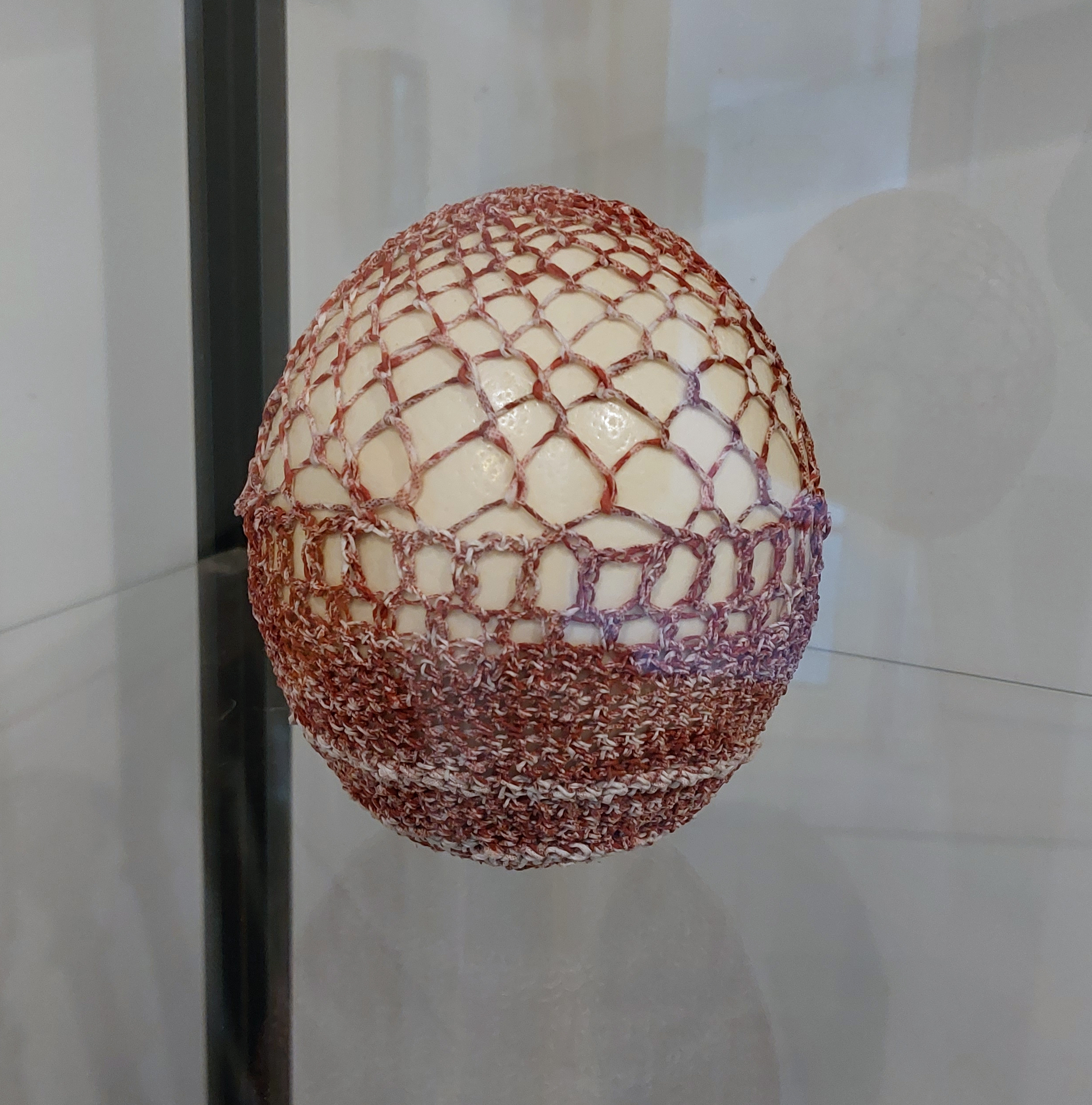 Œuf d'autruche réalisé pour une exposition à la galerie lierman à Liège en 2021. Exposition au profit de la recherche contre le cancer. Œuf d'autruche habillé de fil fait à partir de papier d'emballage camembert. crochet et point loop à l'aiguille