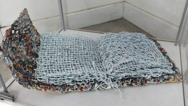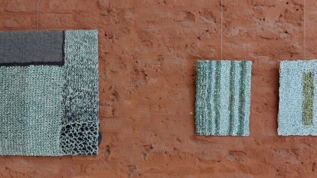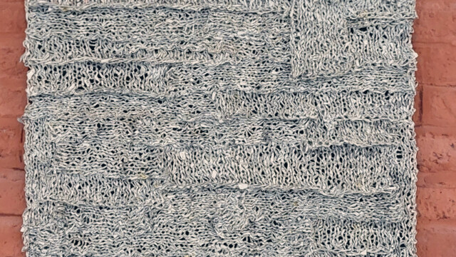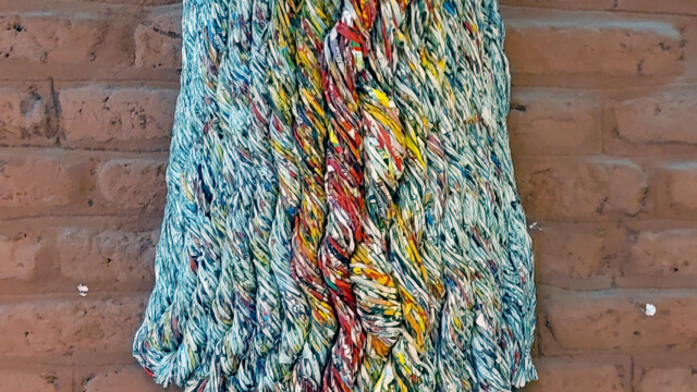 Les petits formats sont de dimensions A4. Tricots. Fil fait main avec du papier de listing informatique, papier vert sélectionné dans les pages de magazines. 2017.