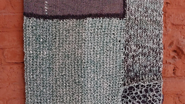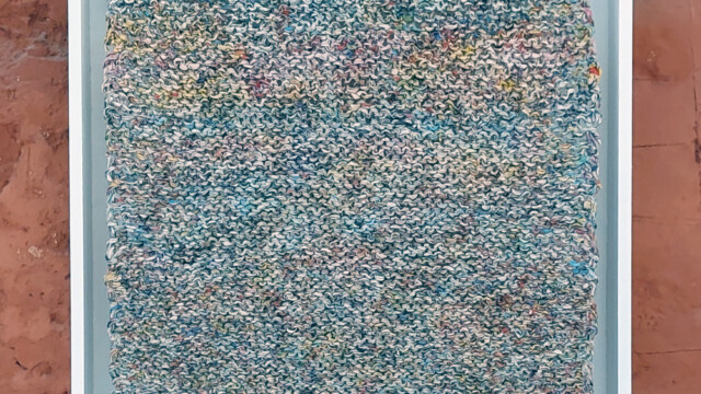 Carré 50 x 50 cm tricoté , avec des grosses aiguilles ou des plus fines aiguilles ce qui donne le point ajouré ou serré. Fil fait main avec du papier journal, programme tv, papier d'emballage chicon, listing informatique. Le tricot est mis dans une boîte en bois peinte de couleur blanche aux dimensions plus ou moins 53 x 53 cm