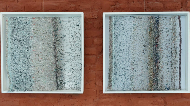 Du papier déchiré, assemblé, entortillé, enroulé, tricoté, tramé, l’artiste poursuit sa création textile par la broderie et ses petits points, de croix, de tige, avant, arrière …